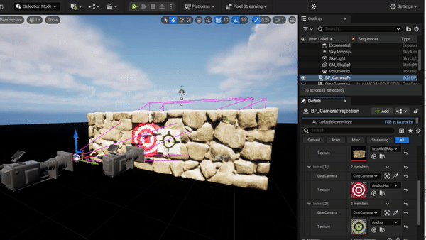For 2.5D and DMP-heavy environments, it can be very useful to have 'live' camera projections inside UE5, rather than having to bake to UV textures. Camera projections have the efficient attribute of increasing texel density near their projection point automatically, which UV bakes do not (at least not without significant work).