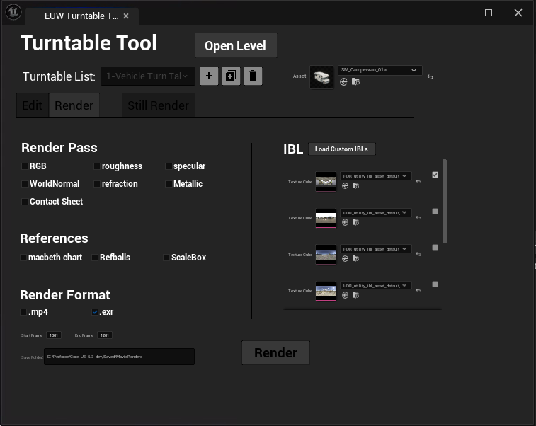 The Turntable Tool is primarily built using Unreal Engine Blueprints. Supplementary Python helper functions are employed for tasks such as managing render sequences, generating contact sheets, and enhancing workflow automation. A burn-in effect is applied to the final render, incorporating branding or information overlays if desired.